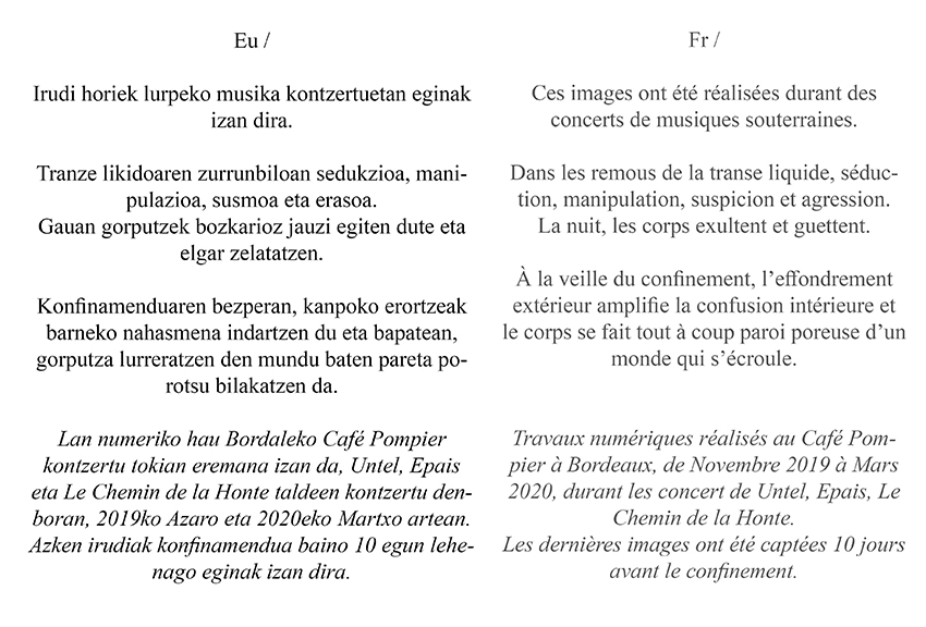 Fr / La transe étira ces nuits qui n’en devint qu’une. Les lumières bleues transformèrent l’air en eau et les humains mutèrent en créatures.